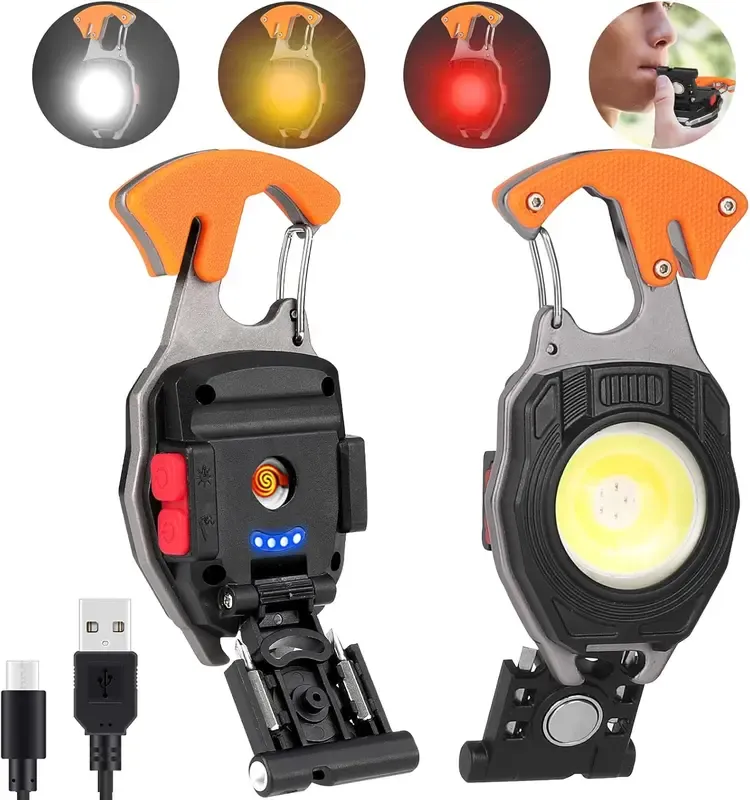 LED mini flashlight multi-functional keychain, rechargeable LED work light, multi-functional flashlight with lighter, screwdriver, magnet, bottle opener, and whistle.121 sales
